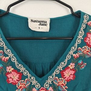 Savanna Jane Turquoise Floral Embroidered Long Sleeve V Neck Blouse Small