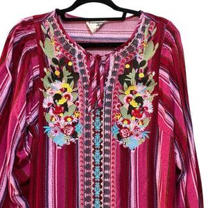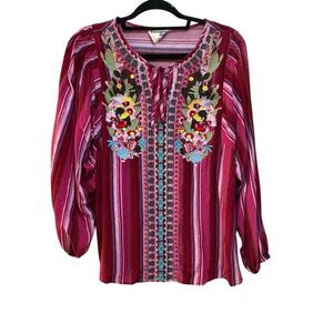 Savanna Jane Women's Blouse Sz S Pink Striped Floral Embroidered