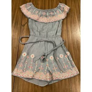 Savanna Jane off the shoulder Romper Blue Shimmer mettalic Floral Embroidered S