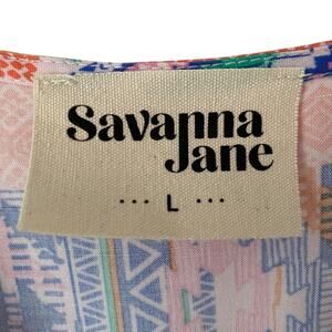 Savannah Jane Patchwork Print Ruffle Mini Dress size large Blue Orange in excellent condition and. Measurements laying flat chest 22 inches across waist elastic 14 1/2 unstretched and 38 inches long length