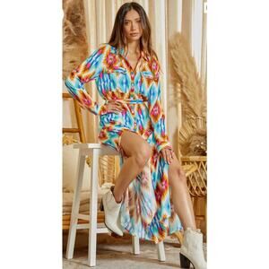 Button down fun print maxi shirt dress with roll up sleeves. Non sheer, woven.