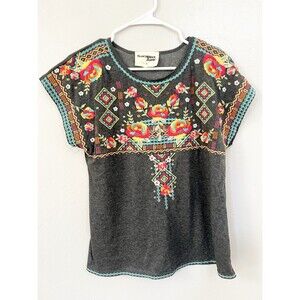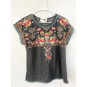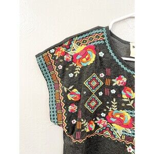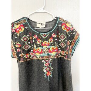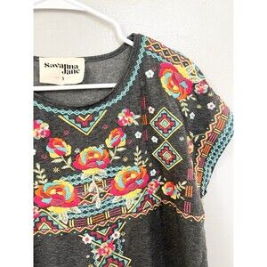 Savannah Jane Women Small Shirt Babydoll Neckline Gray Embroidery Floral Boho