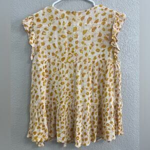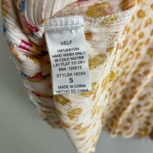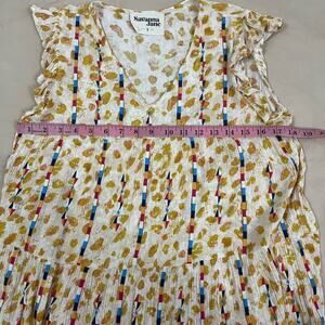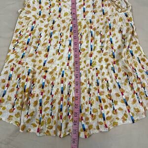 Used, excellent condition. Lightweight, flowy fabric and fit. Multicolored embroidered stripes. Cream top with yellow spots. Approximate measurements shown in photos.