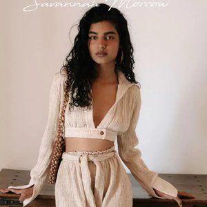 Crafted in new signature blend of natural fibers, Claudia features a plunging neckline and tailored balloon sleeves. The Claudia Blouse is a stunning wardrobe piece that you will cherish forever. Elements of nature are found in the wooden buttons featured on the waist closure and oversized cuffs. Pairs perfectly with our Elle Pant or even your favorite jeans for a casual look.