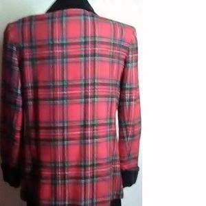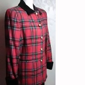 Lined, button front, gold buttons, two pockets, black velvet collar and cuffs