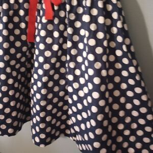 navy blue with white polka dots and very hot pink bow tie belt