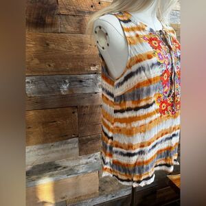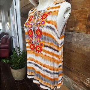 Capture effortless bohemian style with this stunning sleeveless top by Savannah Jane. Made from a lightweight, crinkled fabric, this top features horizontal tie-dye stripes in warm earthy tones of burnt orange, ivory, and gray. The standout detail is the vibrant floral embroidery down the front, adding a colorful pop of red, fuchsia, yellow, and purple flowers that create an eye-catching focal point.