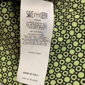 Save The Queen Pants. Pistachio green base color with circular brown design through-out. Made in Italy. Pants are of great quality. WCP-19-0699#L. Measurements are appx. and were taken with garment laying flat: