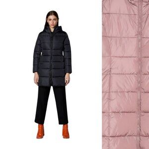 Tags: 100% animal free, Save the Duck puffer jacket, R43110W-MEGA15-80024, coat, lightweight, Nordstrom, new, eco-friendly, Certified B Corporation, faux down, medium, womens, women's, hooded, water repellent, respect, sustainable, sustainability, eco-friendly, winter, fall, autumn, ski, snow, mountain, outdoor, adventure, comfortable, high quality, gorpcore, gorp, Italian, quiet luxury, nylon, long sleeves, winter coat, misty rose, breathable, alexis pink, withered rose, pale purple, packable, travel, vacation, Mega 15, parka, knee-length, long coat, puffer coat, hooded coat, horizontal quilt, quilted, Bloomingdale's, cold weather wear, urban outerwear, alpine style, vegan coat, cruelty-free fashion, storm-ready, luxury puffer