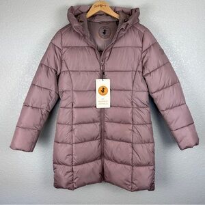 This Save the Duck Taylor long puffer jacket in a misty rose hue combines sustainable style with lightweight warmth, featuring breathable Plumtech synthetic down and a two-way zip closure. Designed with a knee-length cut, attached and adjustable hood, zippered hand pockets, and water-resistant finish, it delivers comfort and weather protection in a cruelty-free construction. New with tags, with two areas of stain (back of the left wrist and bottom front — see photos).