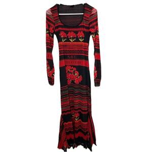This is a bold and dramatic long-sleeve maxi dress featuring a mix of black and deep red horizontal stripes with floral motifs throughout. The dress has a scoop neckline, fitted bodice, and a slightly flared hemline. The fabric appears to be semi-sheer and lightweight, giving it a flowy silhouette.
