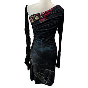 avant garde, art print dress, designer cocktail dress, asymmetrical dress, one shoulder dress, mesh bodycon, whimsygoth, grunge, blokette, gallery outfit, statement fashion, sculptural silhouette, European designer, goth glam, dramatic evening dress, rare, one of a kind, Vintage