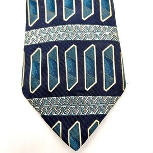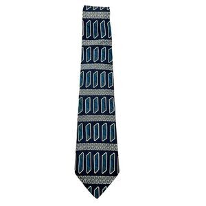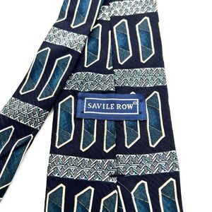Add a touch of elegance to your attire with this Savile Row 100% Silk Tie, expertly crafted in the USA. Featuring a distinctive multi-patterned design in shades of blue, black, and white, this tie is a statement piece for any occasion. Measuring 3 1/2" x 57", it offers a tailored fit that's both stylish and versatile. Preowned and in great condition, this tie is a must-have for the discerning gentleman.