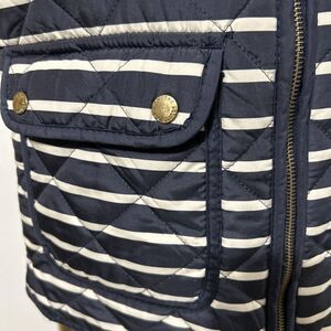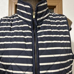 Vest, quilted, black, navy, white, striped, stripes, horizontal, solid, woven, full zip, high neck, mock neck, sleeveless, utility pockets, casual, preppy, classic, nautical, transitional, layering, fall, spring, timeless