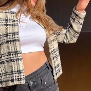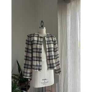 Saville for Nordstrom Women’s Med Blazer Tweed Multicolor Zip Up Light Shoulder Padding Vintage Designer Classy Cream Black Tan Multi-coloured tweed blazer with Zip up front and long sleeves
