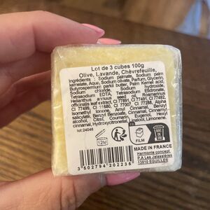 Three cubed shaped soaps. These are a little banged up from traveling back from France, but they were purchased there and smell amazing. Yellow is honeysuckle, purple is lavender and green is olive.