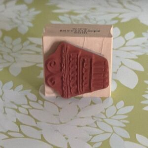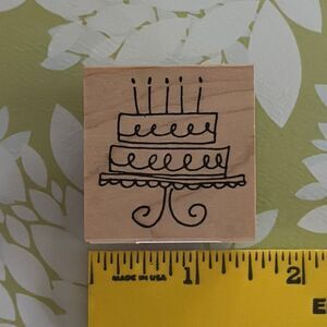 This square rubber stamp features a whimsical multi-tiered birthday cake illustration complete with candles and decorative flourishes. NWT
