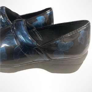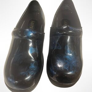 Savvy nursing clogs size 8.5. Black with blue floral and butterfly designs.