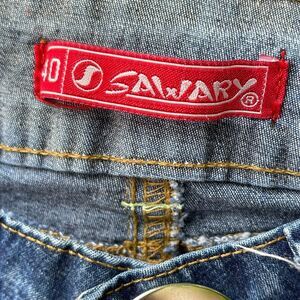Sawary size 40 ( U.S.5/6) Brazilian low cut flare jeans. Huge snap and zipper fly. To of jeans side to side 15”, rise 5.5” and inseam 33”. There is a lighter spot on back. Pointed out in pics.