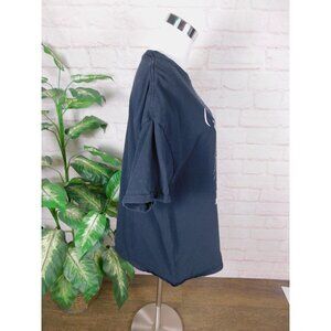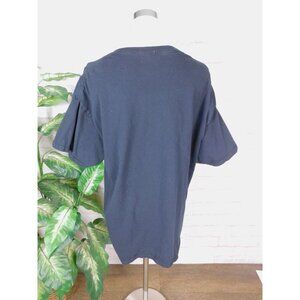 This tee has a distressed, well-loved look with fading, slight stretching, and thinning fabric from wear, adding to its grunge aesthetic. No rips or stains.