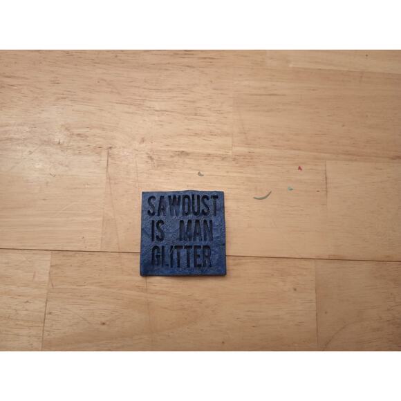 This 3D printed sign says Sawdust is Man Glitter it is 3.5 inches by 3.5 inches.