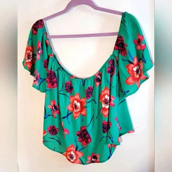 Vibrant floral top with ruffled sleeves. Features a scoop neckline. Perfect for a casual look.