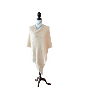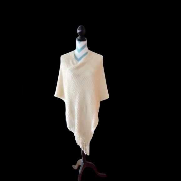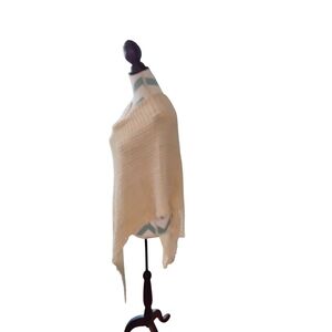 This shawl has a gold like thread to a touch of sparkel to this beige colered one size fits all. Slips over your head.