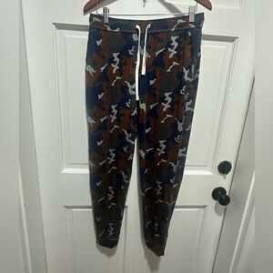 Comfortable lounge pants with a blue and brown camouflage pattern. Ideal for everyday wear.