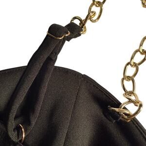 Elevate your wardrobe with this Say What Chain Link Strap Cropped Top in sleek black satin. This structured bustier-style top features a sweetheart neckline, adjustable spaghetti straps with gold chain detailing, and an exposed back zipper for a modern, edgy twist. Crafted from a polyester-nylon blend with light wiring for shape, it offers both support and style. Perfect for pairing with high-waisted jeans, faux leather pants, or a statement skirt for a night out or concert look.
