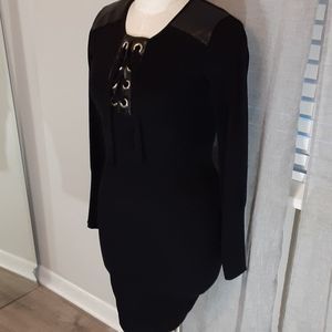 Say What? Black Long Sleeve Sweater Dress with Faux Leather Shoulder Pat…