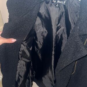 Embrace cozy elegance with the Say What? Black Teddy Jacket, featuring a plush texture and a chic asymmetrical zipper. The lapel collar adds a touch of sophistication, making it a versatile addition to your outerwear collection.