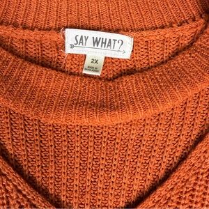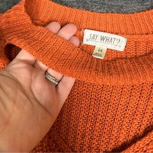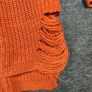 Say what? Burnt orange knit sweater. Long, perfect for legging and boots. Cute neck cutout and fringe details at the bottom