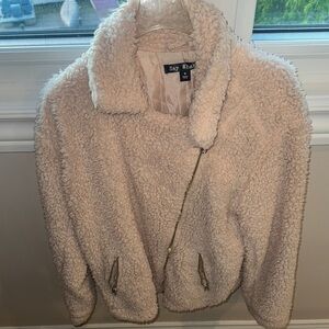 Experience ultimate comfort with the Say What? Cream Teddy Jacket, crafted from soft, fuzzy material for a cozy feel. This versatile piece features a collared neckline and a zip-up front, making it a stylish addition to any wardrobe.