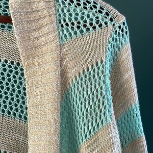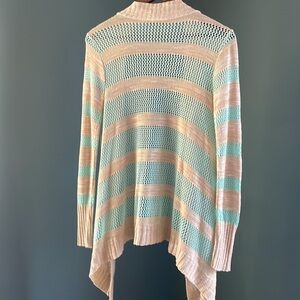 Embrace elegance with this Say What? cardigan, featuring a cream and blue striped design and a draped waterfall-style front. The lightweight knit and asymmetrical hemline offer a comfortable fit, perfect for summer weather