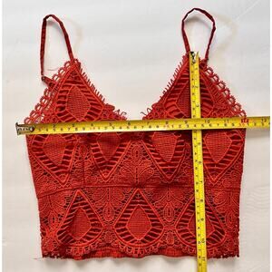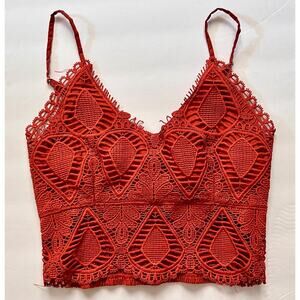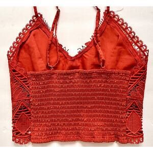Make a statement in this Say What? Crochet Cropped Tank Top, perfect for the boho chic fashionista. Crafted from cotton and lace fabric, this sleeveless top features a V-neckline and crochet accents. The solid pattern and orange rust color make it a perfect addition to your summer wardrobe. This women's small top is lined and has a size type of regular. It is a type of tank that falls under the categories of tops, women's clothing, women, and clothing, shoes & accessories. The style is cropped and the features include crochet and lining. Add this unique piece to your collection and stand out from the crowd.