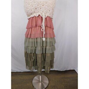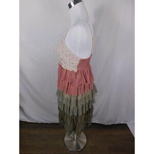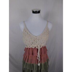 Say What? Dress Womens Medium Pink Green Crochet Bodice Ruffle Tiered Boho Mesh