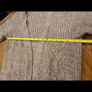 tan open front cardigan with pockets. This is a long cardigan with slits in the side. One spot on the shoulder has loose threads as shown above. measurements are sleeve length 24 inches, length 38 in, arm pit to arm pit 18 in.