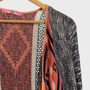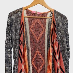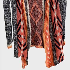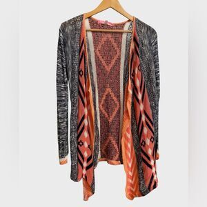 Say What? Open Front Cardigan Size L Multicolor Open Knit Aztec Geometric Print Asymetric
