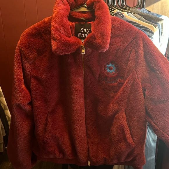 Vibrant red jacket by Say What?. Stylish and bold. Embroidered Club Pilates Logo (Nazareth PA)