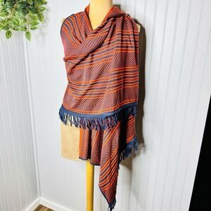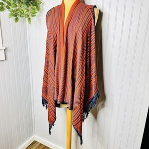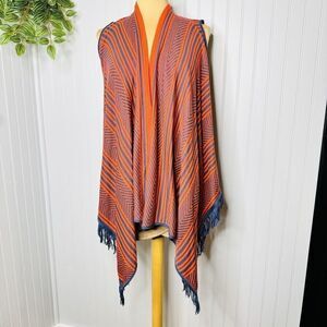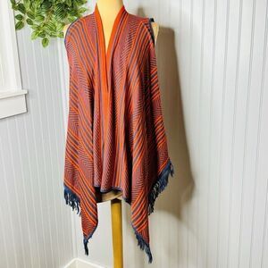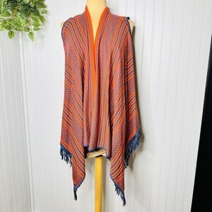 Say What? Sweater Womens Size L Red Blue Striped Fringe Hem Kimono Shawl NWT