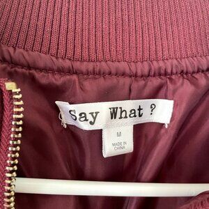 Stay trendy and comfortable with our Say What? red bomber jacket. Perfect for casual wear, this jacket is filled with comfort and style. Featuring multiple pockets for convenience, and designed specifically for women in size M. Stay fashionable and comfortable with our bomber jacket.