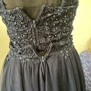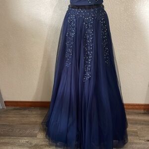 Say Yes to the Prom, navy blue flower lace embellishment sheer dress features intricate lace detailing and a chic flower lace and embellished halter neckline. Small flaws are the hooks to tie neckline are missing it’s an easy fix. Please view last two pictures. No holes no stains in great condition.