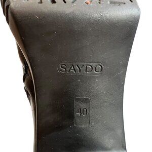 Saydo boots, black leather, short ankle shaft, lightweight, ribbed soles, chunky 3" block heel with slight platform, side zipper, EU 40 / US women's 9, preowned and shows wear on the soles, scuffs - see photos