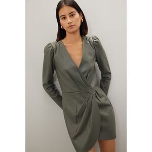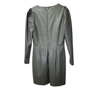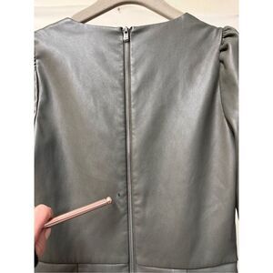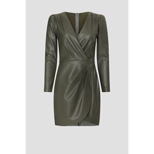 Green faux leather (100% Polyurethane). A-line. V-neck. Long sleeves.