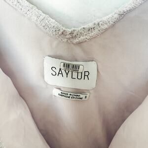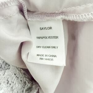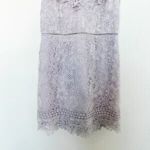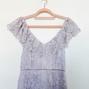 Saylor "Adoa" mini dress crafted from intricate lavender lace. Features fluttery lace cap sleeves, a deep scoop neckline, fitted waist, and scalloped lace hem. Fully lined. Perfect for bridal showers, weddings, graduations, and summer events. Size Small. Excellent condition. No visible flaws. See all photos for details.