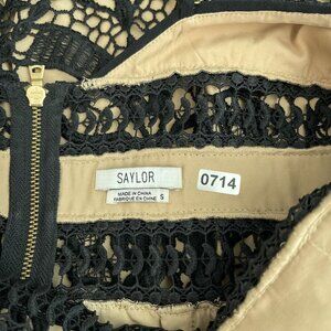 Tags: Black lace dress, Saylor dress, fringe hem dress, formal lace dress, spaghetti strap dress, V-neck midi dress, evening gown, polyester rayon dress, elegant women's wear, cocktail dress, luxury lace dress, fitted lace dress, designer evening wear