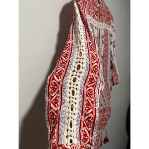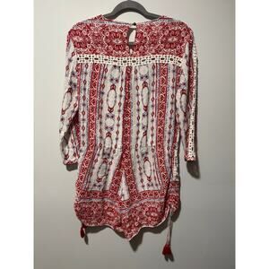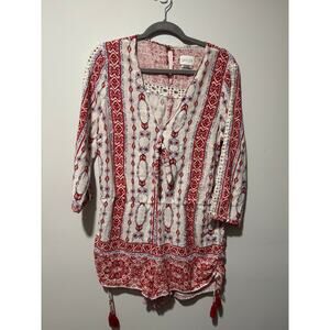 Saylor brand romper, featuring a V-neckline with tassel ties. The romper has a white base with a red and blue floral print, and is completed with three-quarter length sleeves. The short-style romper, suitable for warm weather and has cinchable sizes to make them shorter.