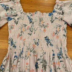 Saylor Clover Smocked Light Pink Floral Swiss Dot Peasant Top. Lightweight. Fit and flare. 100% cotton. Dry clean. 3/4 sleeve. Size XS. Great condition.