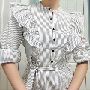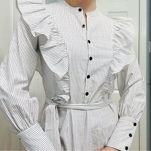 Style: Casual, dainty, twee, coquette, coastal cowgirl styles. White with black stripes. Long sleeves that can be rolled up for a different styling. Buttons up the front with a tie waist. Ruffled details. Great for spring and summer.