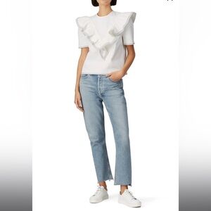 A striped front ruffle adds Victorian drama to this classic crew neck short sleeve top by Saylor.